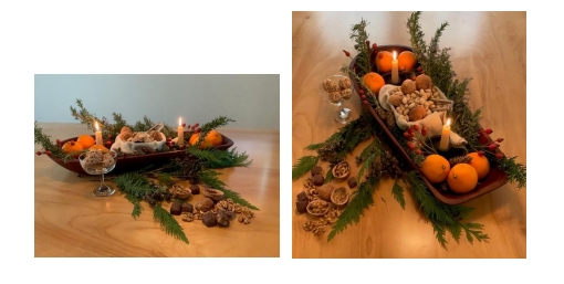 From the entrance, let your eyes drift toward the hall table, mantel, or coffee table youtraditionally decorate for the season. This year, try starting with a colourful textile you love as thebase of your arrangement. Layering textures adds depth and brings a sense of warmth to the room.Place a few fresh evergreen branches gathered from outside to bring the forest scent indoors. Thenadd a cluster of three or more candles in varying sizes. In the evening, light them, settle into yourcouch, and enjoy a peaceful cup of tea in the glow of a soft, relaxed atmosphere.